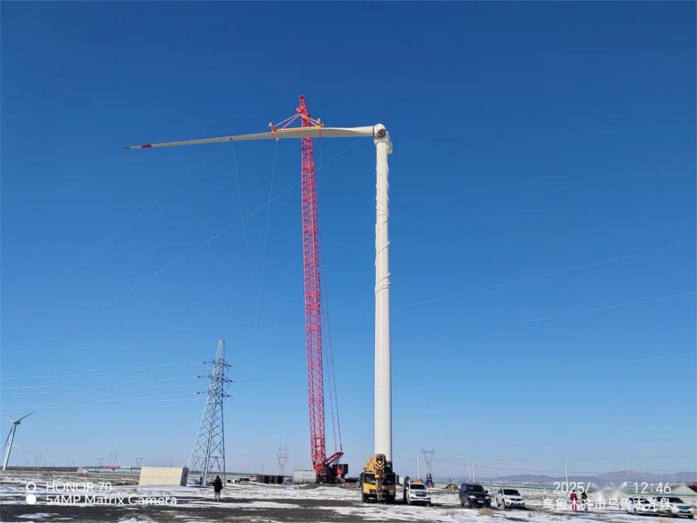 作為疆內(nèi)較早建成的風(fēng)電場之一,達(dá)坂城風(fēng)電一場承載著區(qū)域風(fēng)電產(chǎn)業(yè)起步與發(fā)展的厚重記憶。歷經(jīng)多年運(yùn)行,原有機(jī)組逐漸面臨設(shè)備老化、發(fā)電效率下滑等問題,為破解發(fā)展瓶頸,公司果斷啟動升級改造工程,即拆除低效舊機(jī)組,引進(jìn)金風(fēng)科技7.5兆瓦較大容量風(fēng)電機(jī)組。該項(xiàng)目自啟動以來便面臨多重挑戰(zhàn),特別是進(jìn)入冬季以來,達(dá)坂城區(qū)域風(fēng)力常達(dá)5級以上,惡劣天氣不僅給施工人員帶來身體考驗(yàn),更對吊裝作業(yè)的安全性和精準(zhǔn)度提出極高要求。加之冬季白晝時間短,有效作業(yè)窗口期大幅壓縮,進(jìn)一步增加了施工難度。為確保項(xiàng)目推進(jìn),項(xiàng)目團(tuán)隊(duì)提前研判區(qū)域氣候規(guī)律,制定針對性冬季施工方案,將科學(xué)組織與精細(xì)管理貫穿始終。從塔筒起吊、機(jī)艙就位到葉片精準(zhǔn)對接,每一個環(huán)節(jié)都凝聚著建設(shè)者的智慧與堅(jiān)守。同時,為確保巨大部件在風(fēng)雪中平穩(wěn)吊運(yùn)至預(yù)定位置,項(xiàng)目組全程落實(shí)風(fēng)險(xiǎn)管控措施,細(xì)化安全預(yù)案,對設(shè)備狀態(tài)、作業(yè)環(huán)境進(jìn)行實(shí)時監(jiān)測,最終成功實(shí)現(xiàn)“零事故、零傷害”的安全生產(chǎn)目標(biāo)。